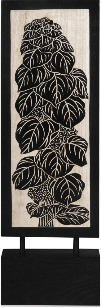 Этот декор удивляет неожиданным сочетанием формы в стиле стрит-дизайна и растительным орнаментом, используемым древними галлами для украшения своих жилищ. Похожие на татуировку, графические изображения агрессивного чертополоха или, напротив, нежных листьев и плодов позволят поместить это панно как в классический, так и в богемный интерьер, а четкая оправа из темного дерева не исключают строгую геометрию супер-современных стилей.