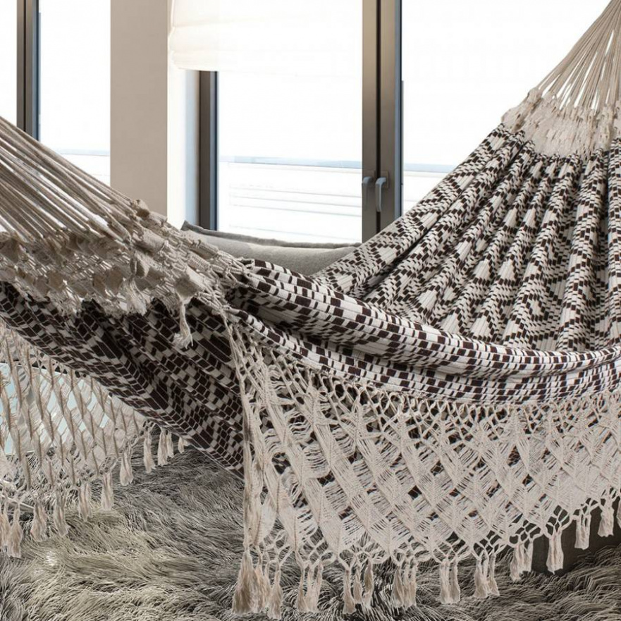 Стильные большие гамаки, расчитанны на трех человек. Прочные веревки и полотно обеспечивают допустимую нагрузку до 180 кг.Жаккардовый рисунок ткани и стильная отделка бахромой придают гамакам неповторимый шарм. Благодаря качественным материалам гамаки имеют длительный срок использования.