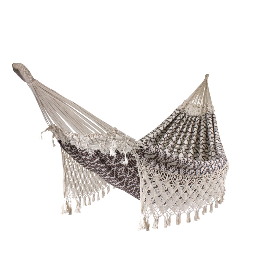 Стильный большой гамак, рассчитан на трех человек. Прочные веревки и полотно обеспечивают допустимую нагрузку до 180 кг. Жаккардовый рисунок ткани и стильная отделка бахромой придают гамаку неповторимый шарм.