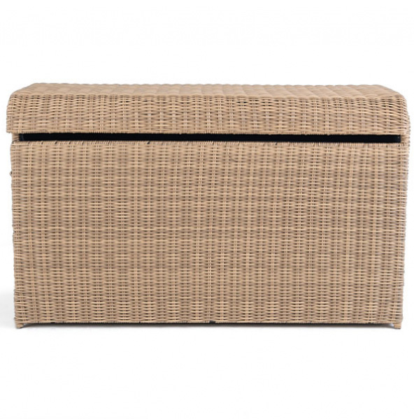 Сундук Миноре из круглого искусственного ротанга соломенного оттенка. Размеры: ширина 60 см, длина 140 см, высота 83 см.
