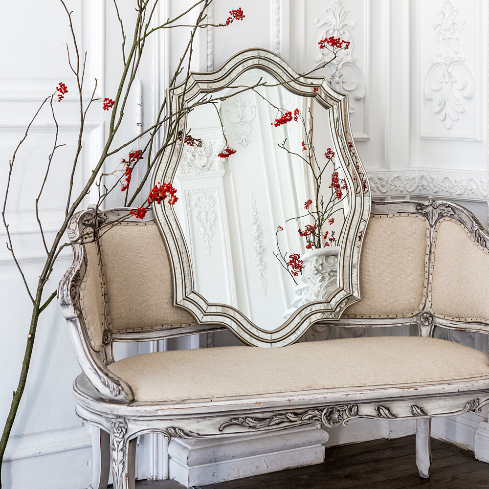 Вековой школой зеркального мастерства стал старинный венецианский стиль, опоясавшей зеркальным слоем всю поверхность, включая раму. Такие зеркала не зависят от интерьерного фона, - они всегда ярки и центральны. Степенная гербовая форма преображена вкусами современного английского модерна: строгость и благородство обретают атмосферную легкость и романтичность.